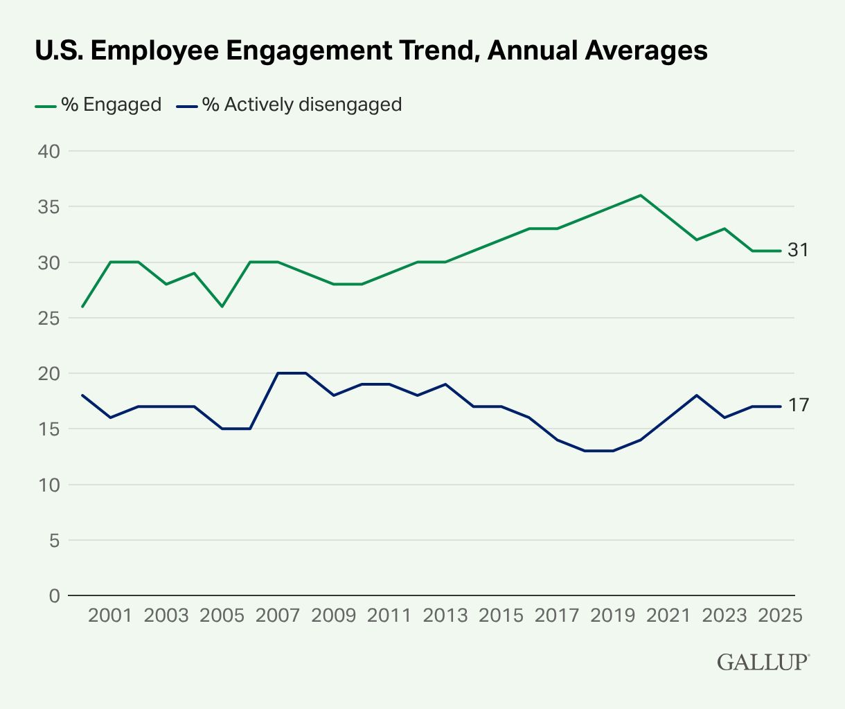 A new Gallup study shows that overall U.S. engagement has hovered at 31%, down from its 2020 peak. The steepest drops are not among seasoned workers, they are among younger employees and early-career professionals.